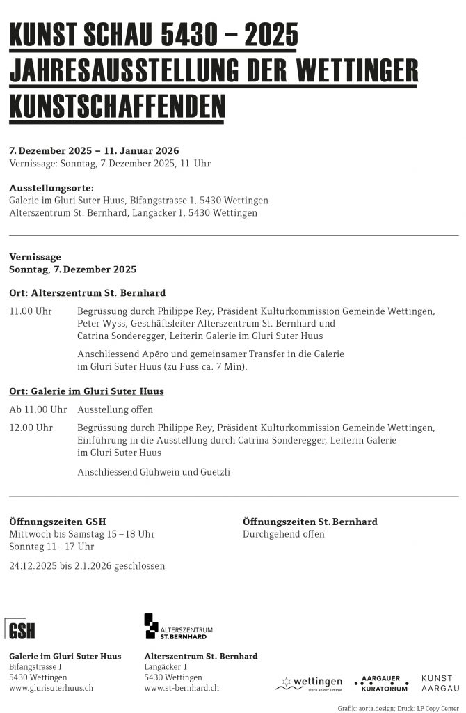 Das Druckkollektiv Ligna ist wieder mit dabei an der Jahresausstellung der Wettinger Kunstschauffenden. Vom 7. Dezember bis 11. Januar 2026 werden 262 Kunstwerke von 75 Künstler:innen in zwei Häusern gezeigt. Die Ligna-Holzdrucke sind in der Galerie im Gluri Suter Huus zu sehen. Koordinaten, Öffnungszeiten und mehr Infos unter: https://glurisuterhuus.ch
